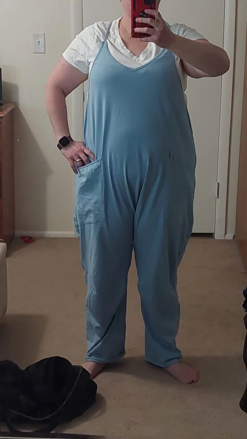 This is my favorite jumpsuit of all time it is so comfortable so stretchy, I bought this way before I was pregnant I wore all the time and now that I am pregnant it still fits great.